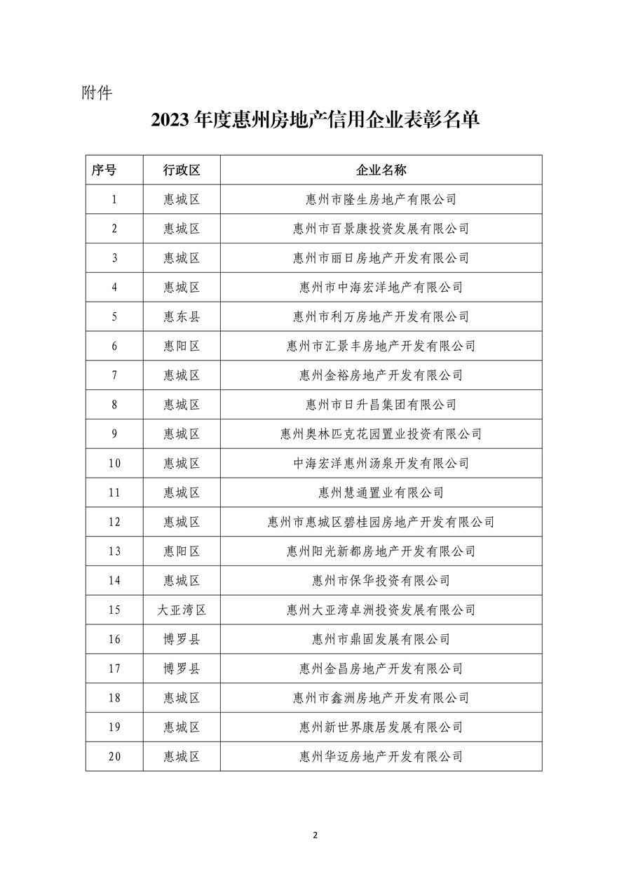 惠州市房地產(chǎn)業(yè)協(xié)會依據(jù)《惠州市房地產(chǎn)開發(fā)企業(yè)信用管理辦法》(修訂版),本著“公開、公平、公正”的原則,根據(jù)“惠州市房地產(chǎn)開發(fā)企業(yè)信用管理平臺”信用分值排名,并征求相關職能部門對初步入圍名單的評審指導意見,形成初評名單。后經(jīng)過公示環(huán)節(jié),并綜合主流媒體和公眾意見,形成最終表彰名單;葜菔20家房地產(chǎn)開發(fā)企業(yè)被授予“2023年度惠州房地產(chǎn)信用企業(yè)”稱號!其中包含惠州市隆生房地產(chǎn)有限公司、惠州奧林匹克花園置業(yè)投資有限公司等本地知名房企。