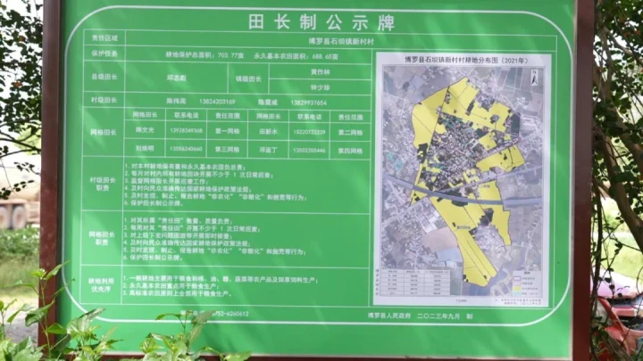 在博羅縣石壩鎮(zhèn)新村,綠油油的田埂上,田長公示牌特別顯眼,上面詳細標明了四級田長的姓名和聯(lián)系方式,田長職責、監(jiān)督舉報電話等信息也一目了然。該村耕地面積有700多畝,共設立了2個村級田長和4個網(wǎng)格田長進行巡田,各田長均安裝有巡田APP軟件,分別按照不低于每月一次、每周一次的頻率進行巡田。