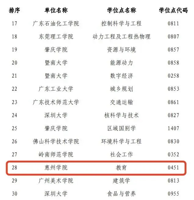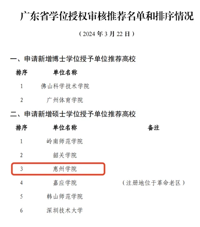 3月22日,廣東省教育廳公示新增博士碩士學(xué)位授權(quán)審核推薦名單和排序情況。其中,惠州學(xué)院入選廣東申請(qǐng)新增碩士學(xué)位授予單位推薦高校,排名第3。該校電子信息、材料與化工、教育入選廣東申請(qǐng)新增碩士學(xué)位授權(quán)點(diǎn)推薦名單,三個(gè)學(xué)位點(diǎn)排序依次為第3、第9、第28。