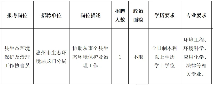 惠州市生態(tài)環(huán)境局龍門分局2024年公開招聘編外人員