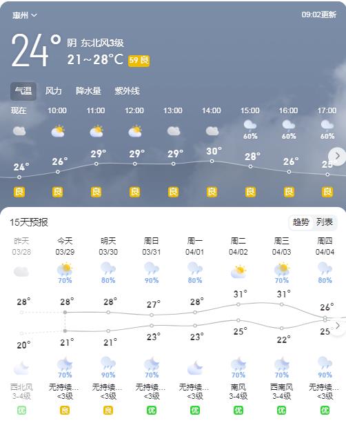 惠州日?qǐng)?bào)訊 (記者劉建威)惠州市氣象臺(tái)3月28日下午發(fā)布重大氣象信息,預(yù)計(jì)29日我市各地多云間陰天,有分散(雷)陣雨;30~31日將出現(xiàn)今年首場(chǎng)強(qiáng)對(duì)流天氣過程,有中到強(qiáng)雷雨局部暴雨,局地伴有短時(shí)強(qiáng)降水、6~8級(jí)雷雨大風(fēng)和冰雹等強(qiáng)對(duì)流天氣,最大小時(shí)雨強(qiáng)20~40毫米;4月1~2日,有陣雨或雷陣雨。