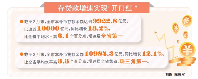 具體看,截至2月末,全市本外幣存款余額達(dá)到9922.8億元,已逼近10000億元,同比增長(zhǎng)13.2%,比全省平均水平高6.1個(gè)百分點(diǎn),增速居全省第一;全市本外幣貸款余額10984.3億元,同比增長(zhǎng)12.1%,比全省平均水平高3.3個(gè)百分點(diǎn),增速居全省第四、珠三角第一。