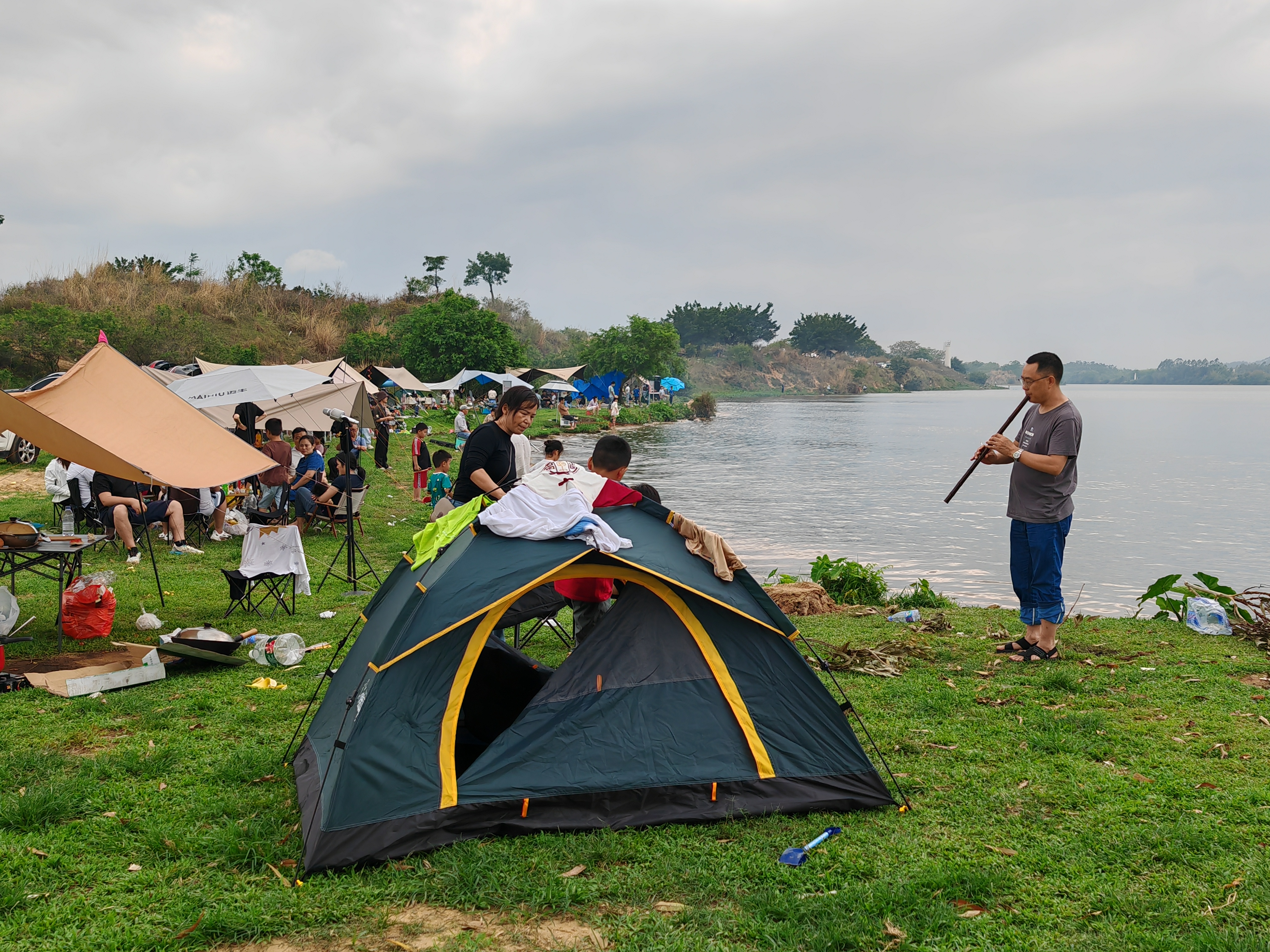 春季草長鶯飛,親近自然成為親子家庭的首選。4月4日,記者來到惠城區(qū)濱江體育休閑公園,目之所及少不了遍地開花的帳篷。帳篷下,有人躺在便捷躺椅上小憩或閱讀,有人用便攜式咖啡壺做手沖咖啡,還有人悠閑地在江邊吹著笛子,聽著音樂……