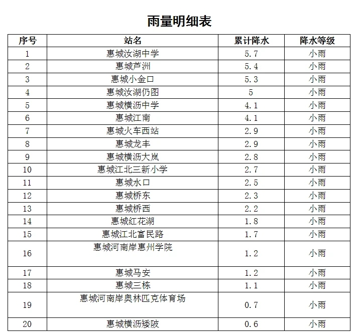 統(tǒng)計(jì)數(shù)據(jù)顯示,5日17時至6日17時,我市共有雨量站180個,全部站點(diǎn)出現(xiàn)降水。全市平均雨量31.7毫米,有4個站點(diǎn)錄得100~250毫米累積雨量,有17個站點(diǎn)錄得50~100毫米累積雨量,有70個站點(diǎn)錄得25~50毫米累積雨量,各縣區(qū)最大降水量(單位:毫米)分別為:龍門永漢南昆山130.3、大亞灣三門島62.4、博羅公莊官山59、惠城汝湖中學(xué)37.9、惠東巽寮29.6、仲愷潼湖24.4、惠陽平潭陽光23.1。