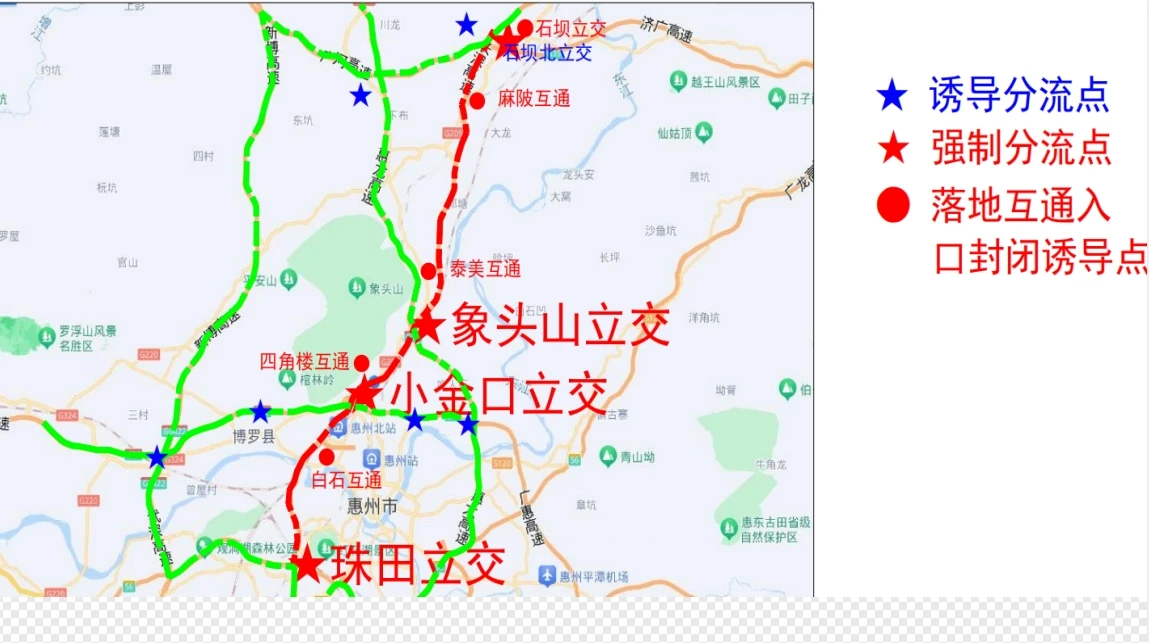 同時(shí),經(jīng)廣惠高速小金口樞紐互通上高速往河源方向的車輛,可通過惠州大道—金羅路—金龍大道從廣惠高速金龍收費(fèi)站上高速繞行;往深圳方向的車輛,可通過惠州大道—小金河大道從長(zhǎng)深高速惠州北收費(fèi)站上高速繞行。高接高北往南方向的車輛,可通過廣河高速、汕湛高速、惠龍高速、新博高速、廣龍高速、廣惠高速通行。高接高南往北方向的車輛,可通過廣龍高速、廣惠高速、武深高速、惠龍高速、廣河高速、汕湛高速通行。