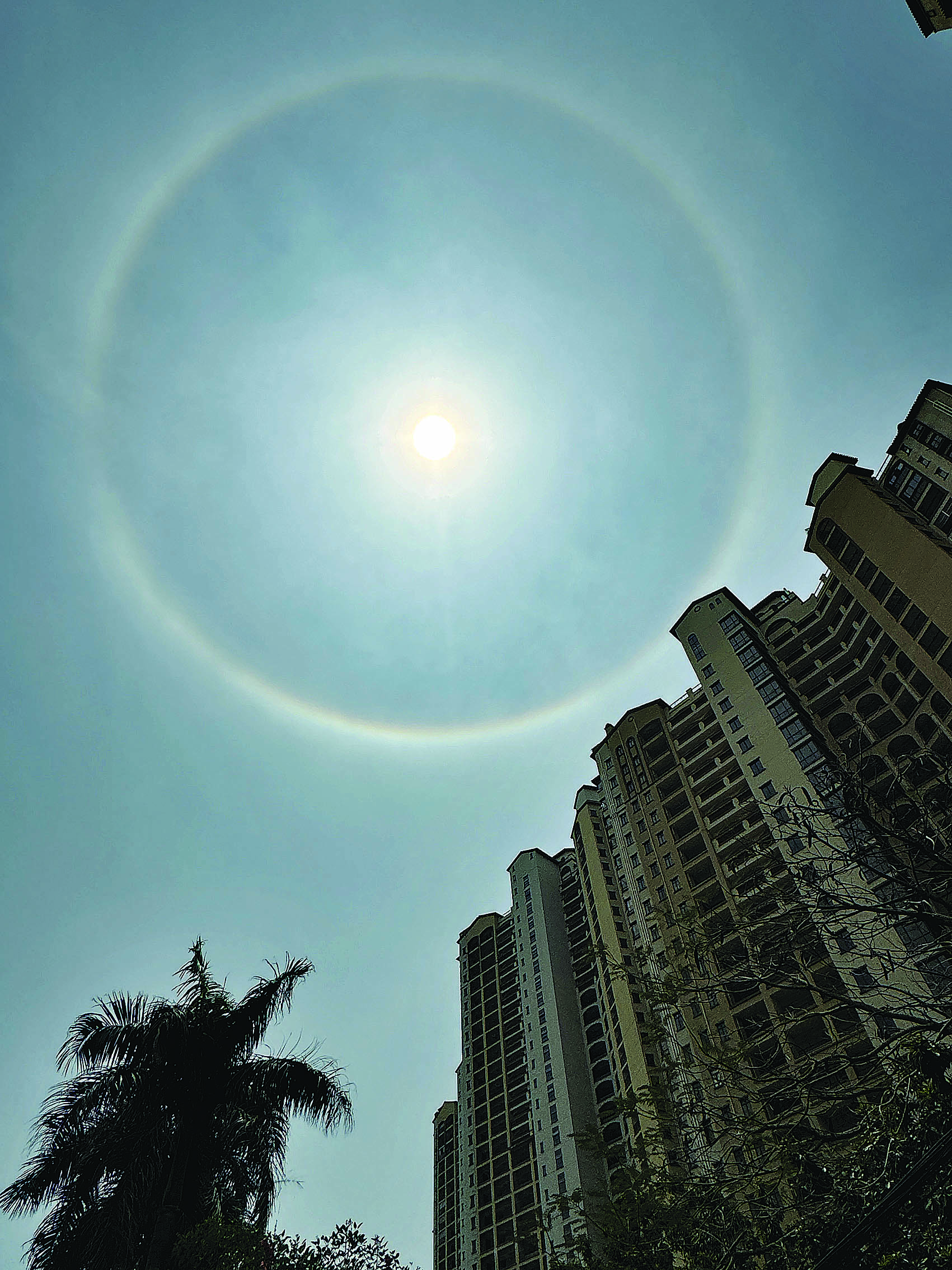 4月10日中午,惠州上空出現(xiàn)“日暈”現(xiàn)象,肉眼可見太陽周圍有一個巨大彩色光環(huán)。