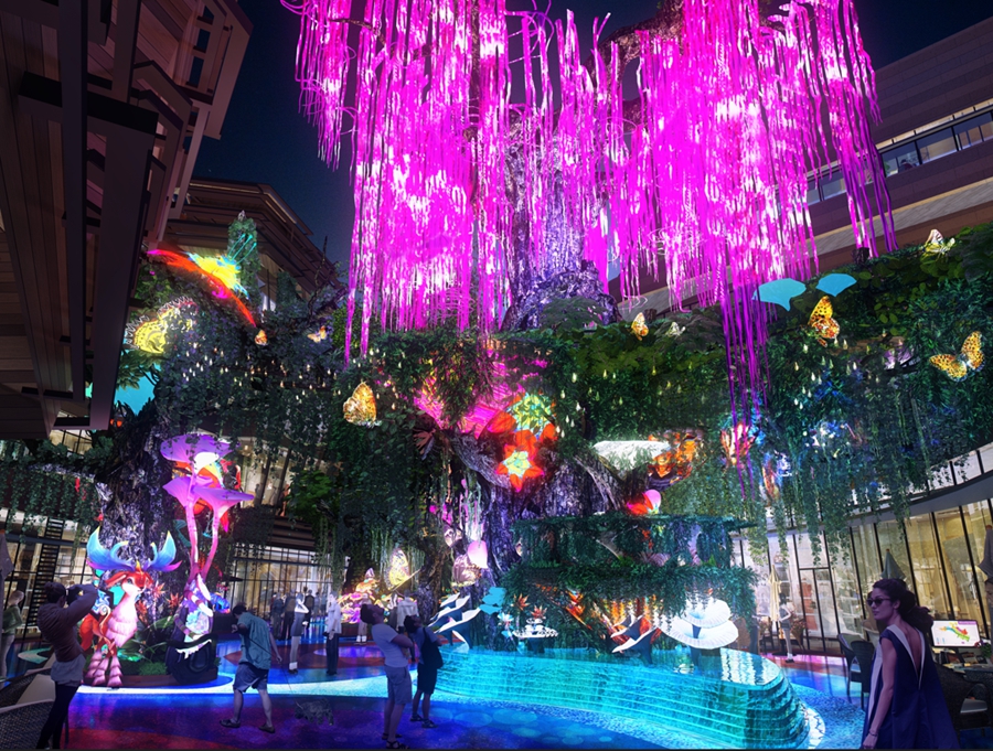 以港惠三期重點(diǎn)打造的情景式主題街區(qū)“蝶樹溪谷”為例,蝶樹溪谷以葛洪遺衣化蝶的傳說為線索,營造出如夢(mèng)如幻的羅浮意境空間,溪谷內(nèi)五大神樹齊聚,奇花異草、發(fā)光植物以此為家,動(dòng)植物精靈在此自由自在地嬉戲玩耍,呈現(xiàn)出一個(gè)生機(jī)盎然、唯美夢(mèng)幻的生態(tài)溪谷場景。
