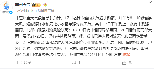 預(yù)計(jì),17日起我市雷雨天氣趨于頻繁,并伴有8~10級(jí)雷暴大風(fēng)、短時(shí)強(qiáng)降水和局地小冰雹等強(qiáng)對(duì)流天氣。其中17日下午到上半夜有中到強(qiáng)雷雨,北部出現(xiàn)強(qiáng)對(duì)流風(fēng)險(xiǎn)較高;18-19日有中雷雨局部暴雨;20日雷陣雨局部大雨;展望21-23日,仍有持續(xù)強(qiáng)降雨過程。我市已進(jìn)入強(qiáng)對(duì)流天氣和暴雨多發(fā)季節(jié),需注意防范雷擊和短時(shí)大風(fēng)造成的高空作業(yè)設(shè)施、廠房工棚、臨時(shí)構(gòu)筑物、戶外廣告牌、樹木倒塌等風(fēng)險(xiǎn),并注意防御強(qiáng)降水及其可能導(dǎo)致的城鄉(xiāng)積澇、山洪、泥石流和山體滑坡等次生災(zāi)害;葜菔袣庀笈_(tái)4月16日14時(shí)發(fā)布