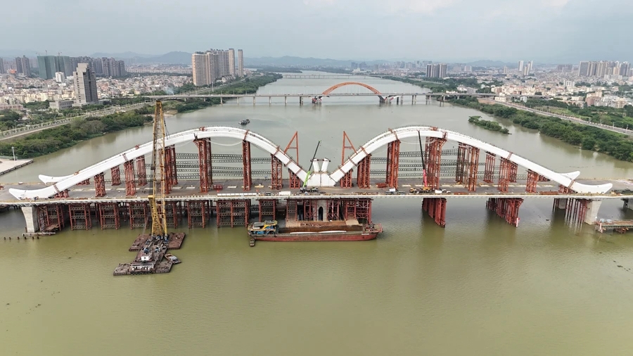 目前,鵝城大橋全橋樁基已完成,江東一號路A匝道及輔道已通車,主橋下部架構及鋼梁架設已完成,拱肋已完成38個,鵝塔已完成2個,預計5月初主橋拱肋合龍,屆時將以天鵝之姿矗立于東江之上。