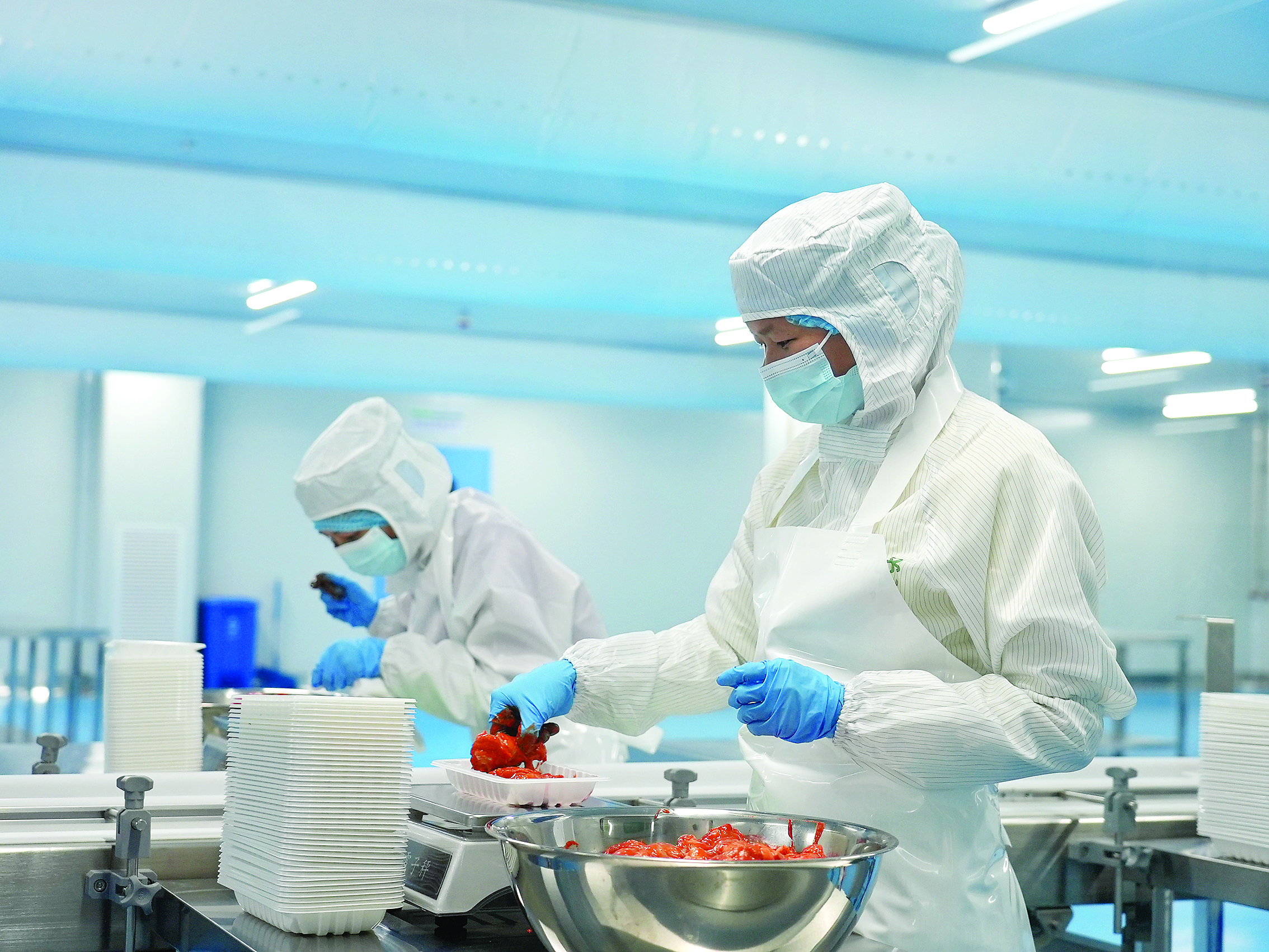優(yōu)予食品生產(chǎn)車間內(nèi),員工在制作預(yù)制菜;葜萑請(bào)記者哈鵬 攝