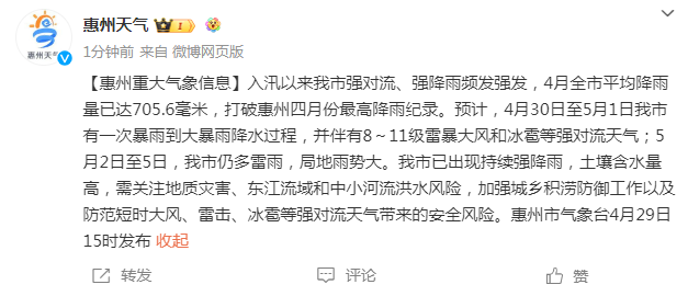 惠州市氣象臺4月29日15時(shí)發(fā)布惠州重大氣象信息