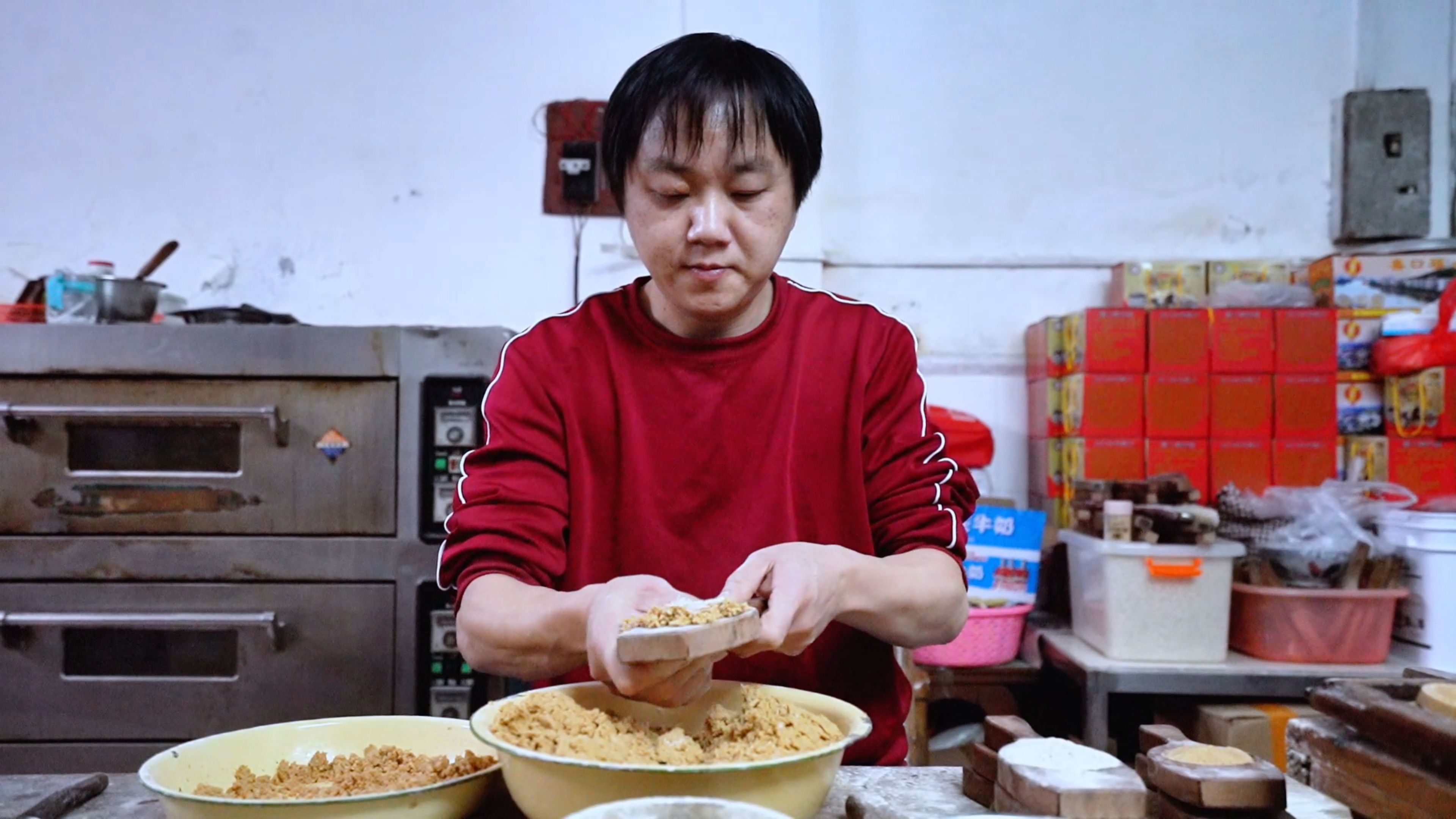 從龍門縣城谷行街轉進賣籮街,狹窄的街道里有家老字號——喜口福餅家。傍晚時分,餅模敲打聲此起彼伏,餅香四溢。每每聽到店鋪里發(fā)出“哐哐”聲響,意味著一盤米餅即將出爐,欲買米餅的街坊便心領神會地往店鋪趕去。