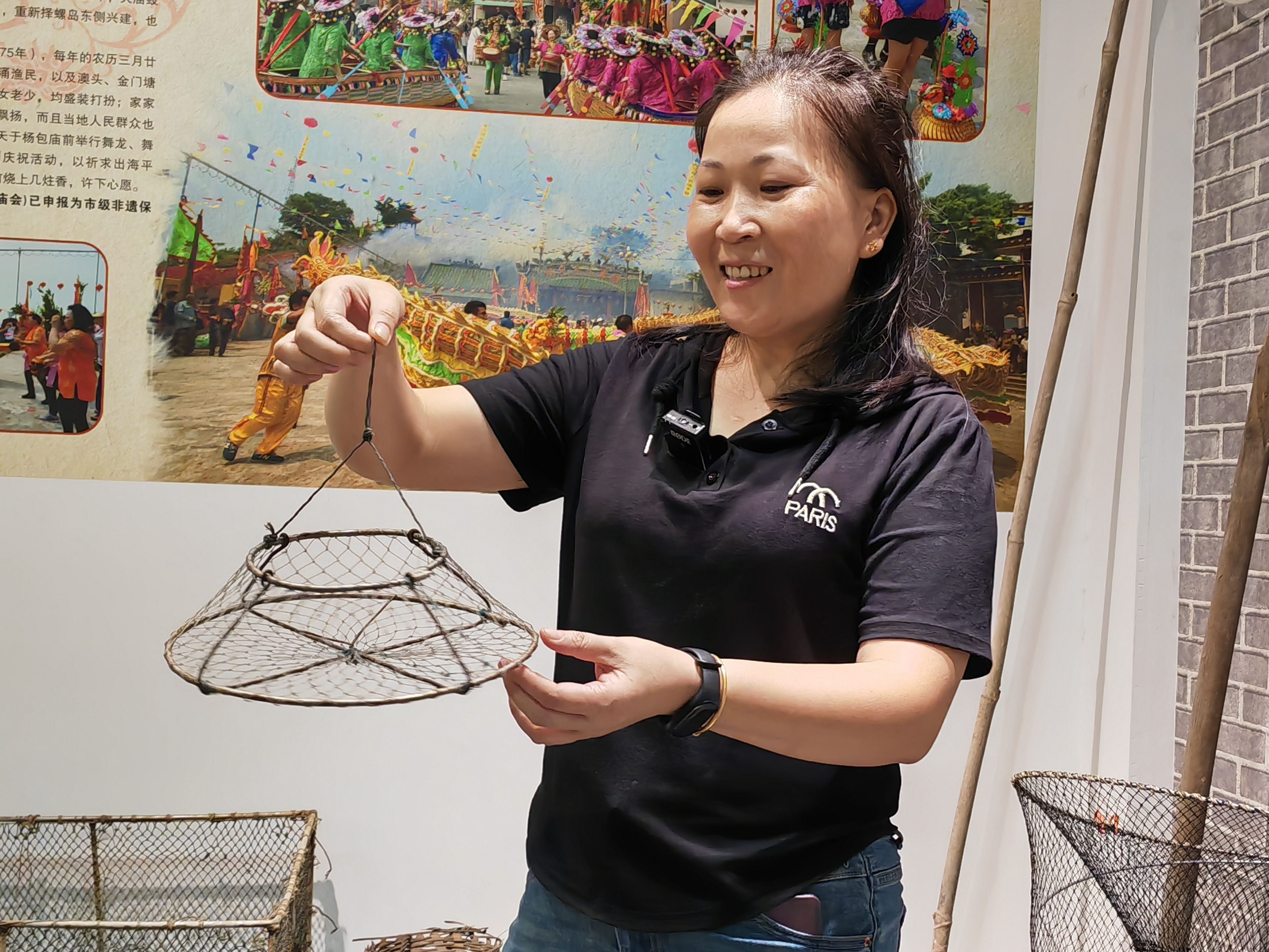 你瞧!這個是石螺籠,它是過去漁民在海里抓石螺、花螺時用的工具,外形像一個鐵絲扎的圓形燈籠,上面寬口,底部和四周是細密的網格。石螺籠子中間有一條鐵絲,漁民用腌制好的咸魚插在鐵絲上做誘餌。霞涌街道文化站工作人員張明妹介紹,出海抓石螺時,漁民用一根長長的線,把多個石螺籠串起來沉到海底,等待一夜后收網,籠子里便有收獲:石螺、花螺乖乖地待在籠子里了。