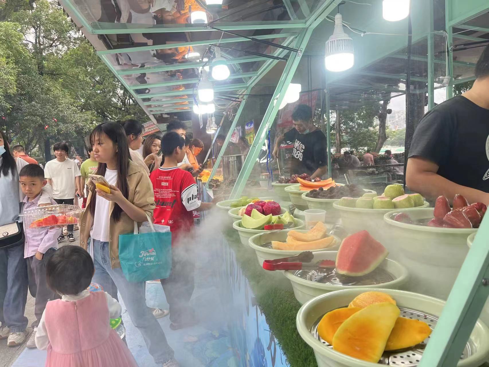 市民游客在“東坡市集”攤位前品嘗購(gòu)買(mǎi)水果。
