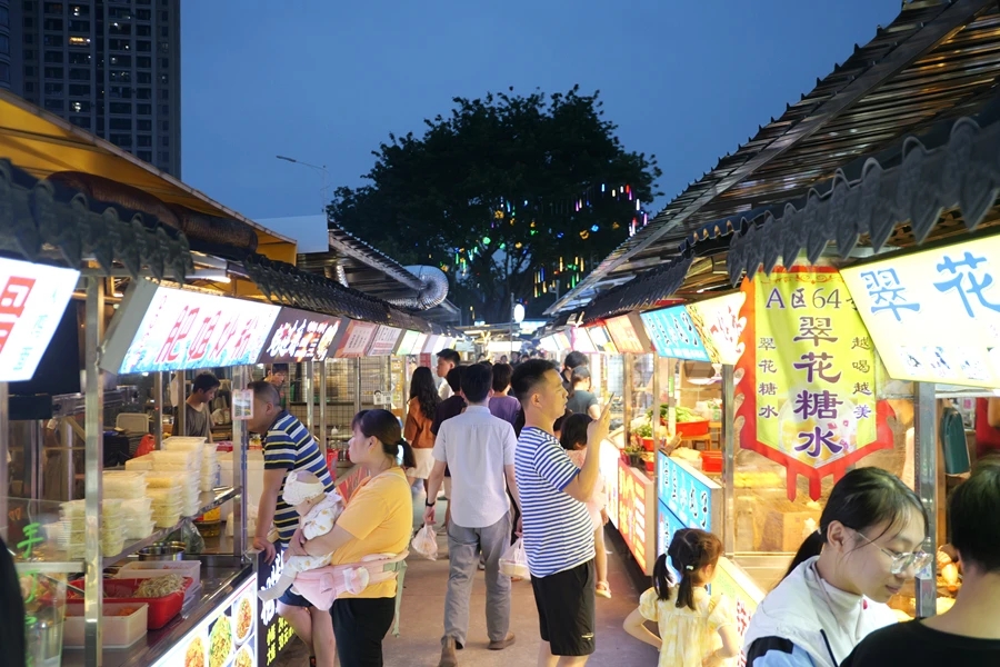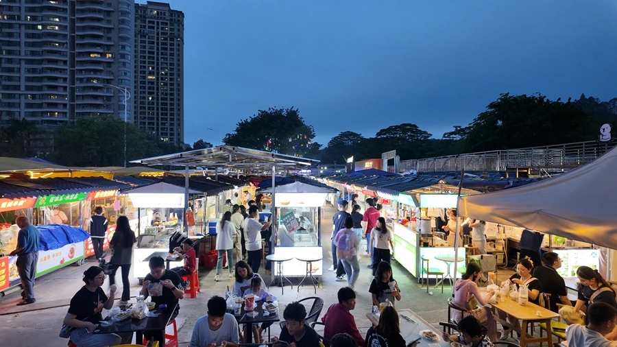 皓月園美食街占地面積不大,卻聚集著200余家美食攤位,每天下午4時(shí)起,這里就開始對(duì)外營(yíng)業(yè)了,一直到晚上12時(shí)才結(jié)束。穿梭美食街中,蠔蛋燒、螺螄粉、蘿卜牛雜、腐乳雞翅、雜糧煎餅、甜品、飲料等各色小吃琳瑯滿目,香氣四溢、氤氳醉人,點(diǎn)亮“五一”假期夜生活。