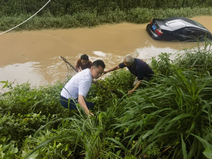 當(dāng)時(shí)已來不及多想,熊曉朋、林煥中立即驅(qū)車上前,發(fā)現(xiàn)一輛黑色小車掉進(jìn)路邊的水溝里,水已接近淹沒前車窗,小車司機(jī)緩慢從車窗爬出,向車頂爬去,車頭正往水溝中繼續(xù)沉入,情勢非常危險(xiǎn)。