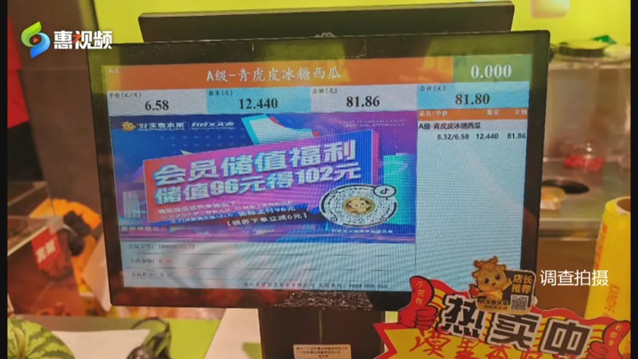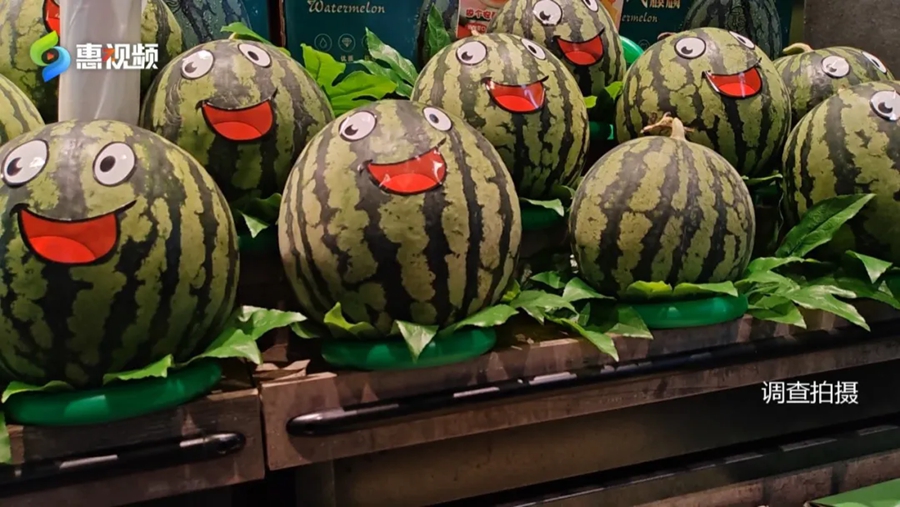 在這家連鎖水果店里,記者還看到了一款“青虎皮冰糖西瓜”,店家用表情貼紙做包裝,看著倒是精致,價(jià)格也挺高端,上秤一稱,一個(gè)西瓜就要81元。