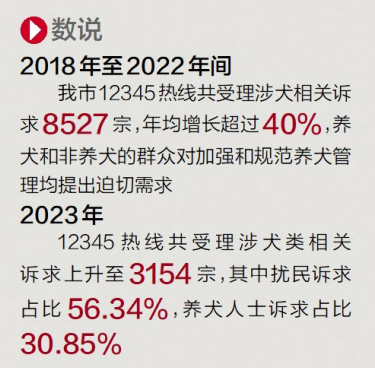 隨著家庭飼養(yǎng)的犬只種類、數(shù)量日益增多,由于認知差異、管理缺失、政策滯后等因素,養(yǎng)寵人士和恐寵人士之間易產(chǎn)生矛盾。數(shù)據(jù)顯示,去年12345熱線共受理涉犬類相關(guān)訴求上升至3154宗,其中擾民訴求占比56.34%,養(yǎng)犬人士訴求占比30.85%。