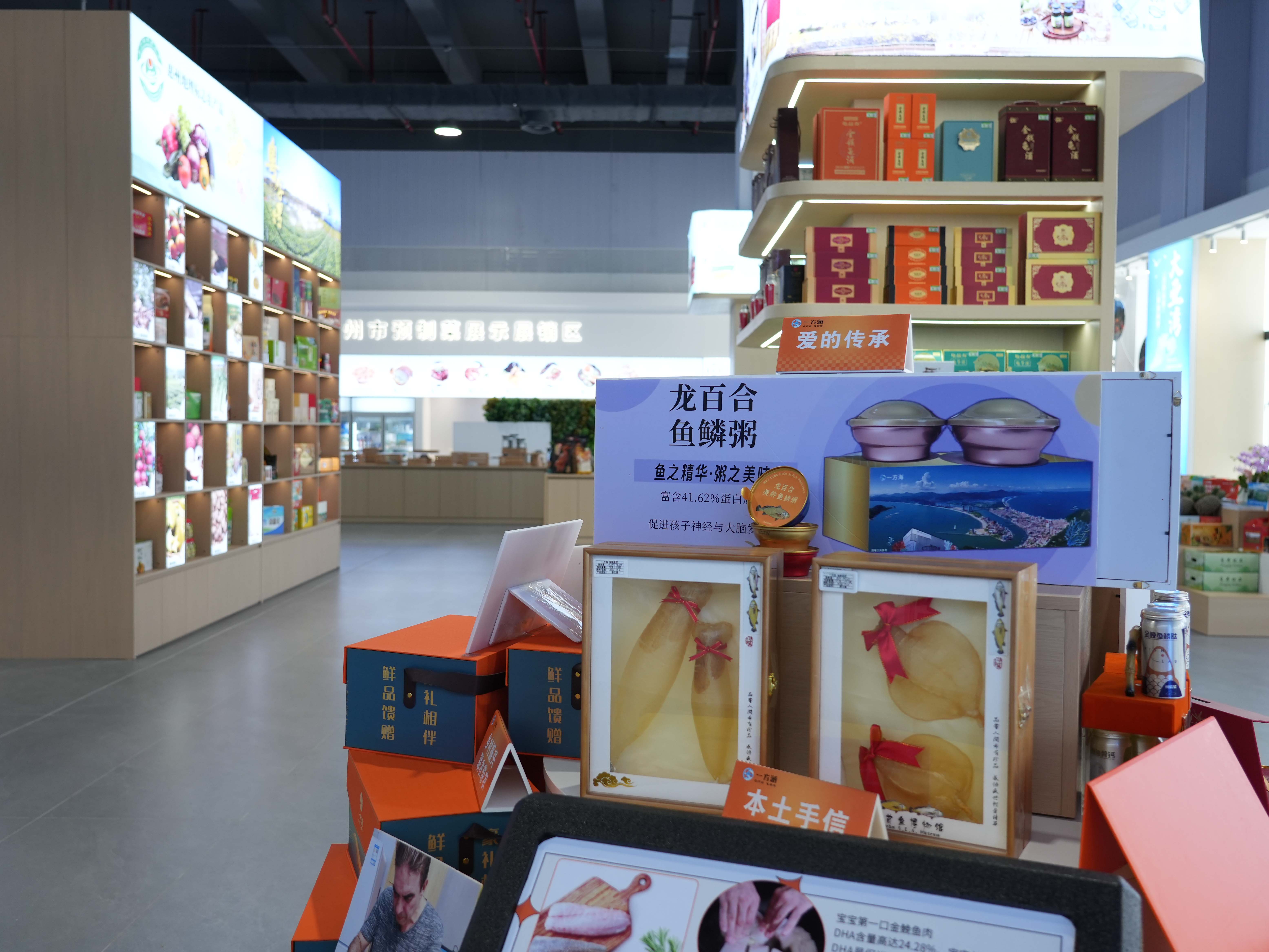 在惠州館中心位置則設(shè)置了茶情惠州區(qū),通過背景展板、產(chǎn)品陳列、品鑒茶臺的形式進(jìn)行集中展示。其中,背景展板整體介紹我市茶葉產(chǎn)業(yè)基本情況,產(chǎn)品柜重點(diǎn)展示特色茶葉產(chǎn)品,品鑒茶臺提供現(xiàn)場品茶。此外,海洋漁業(yè)區(qū)通過“背景展板+魚缸+產(chǎn)品陳列+燈箱+沙盤”形式,集中展示大黃魚、海龜、金錢龜、觀賞魚等特色活體水生動物,并著重介紹惠州海洋漁業(yè)等情況。