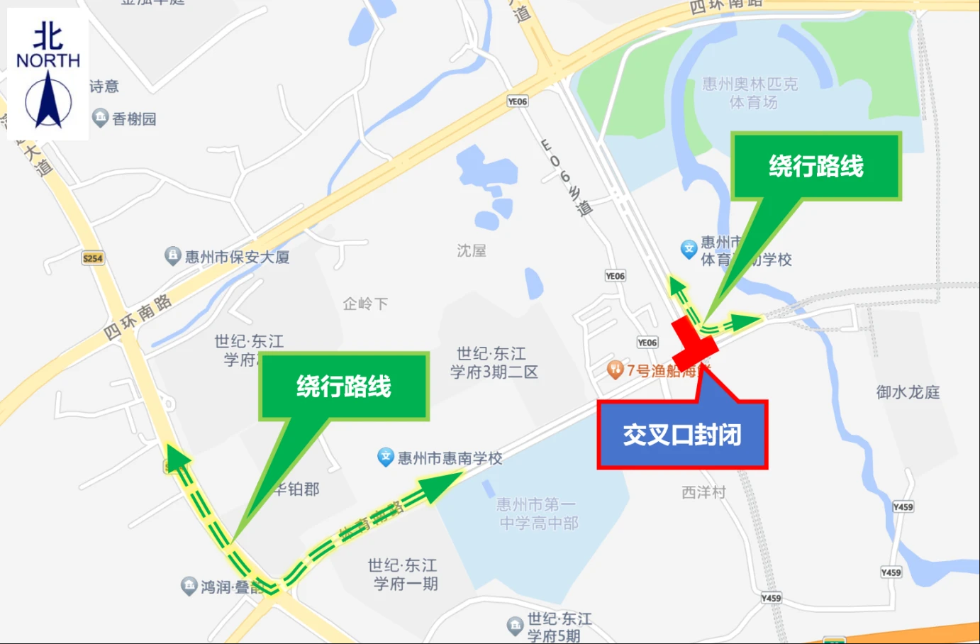 交通管制期間,往返惠州市第一中學(高中部)、世紀東江學府等學;蛐^(qū)的行人和車輛,請通過演達大道繞行;往返惠州市體育運動學校、御水龍庭等學;蛐^(qū)的行人和車輛,可通過惠州市體育運動學校西南側輔道繞行。