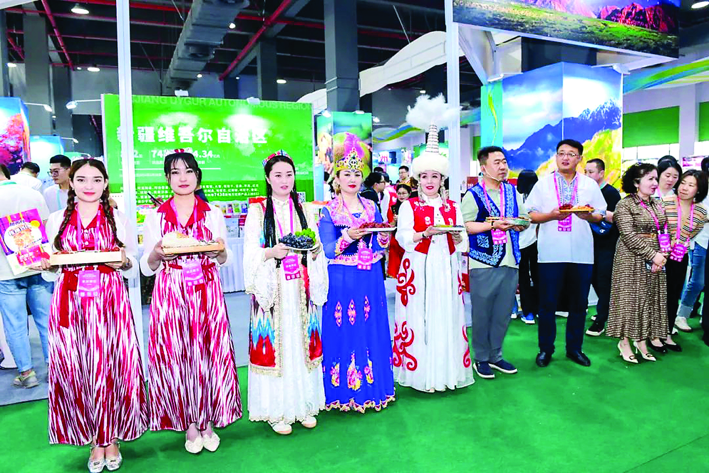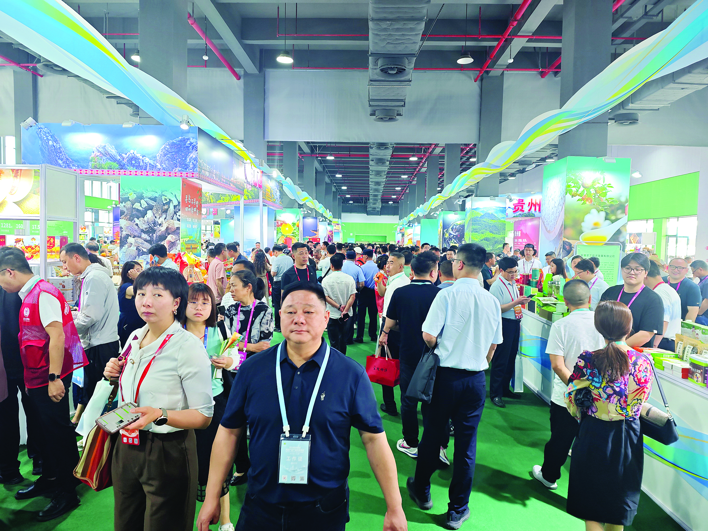一些工作人員身著民族服飾展示特色農(nóng)產(chǎn)品;葜萑?qǐng)?bào)記者李松權(quán) 張藝明 黃鑫威 羅劍業(yè) 游璇鈺 惠州東江圖片社