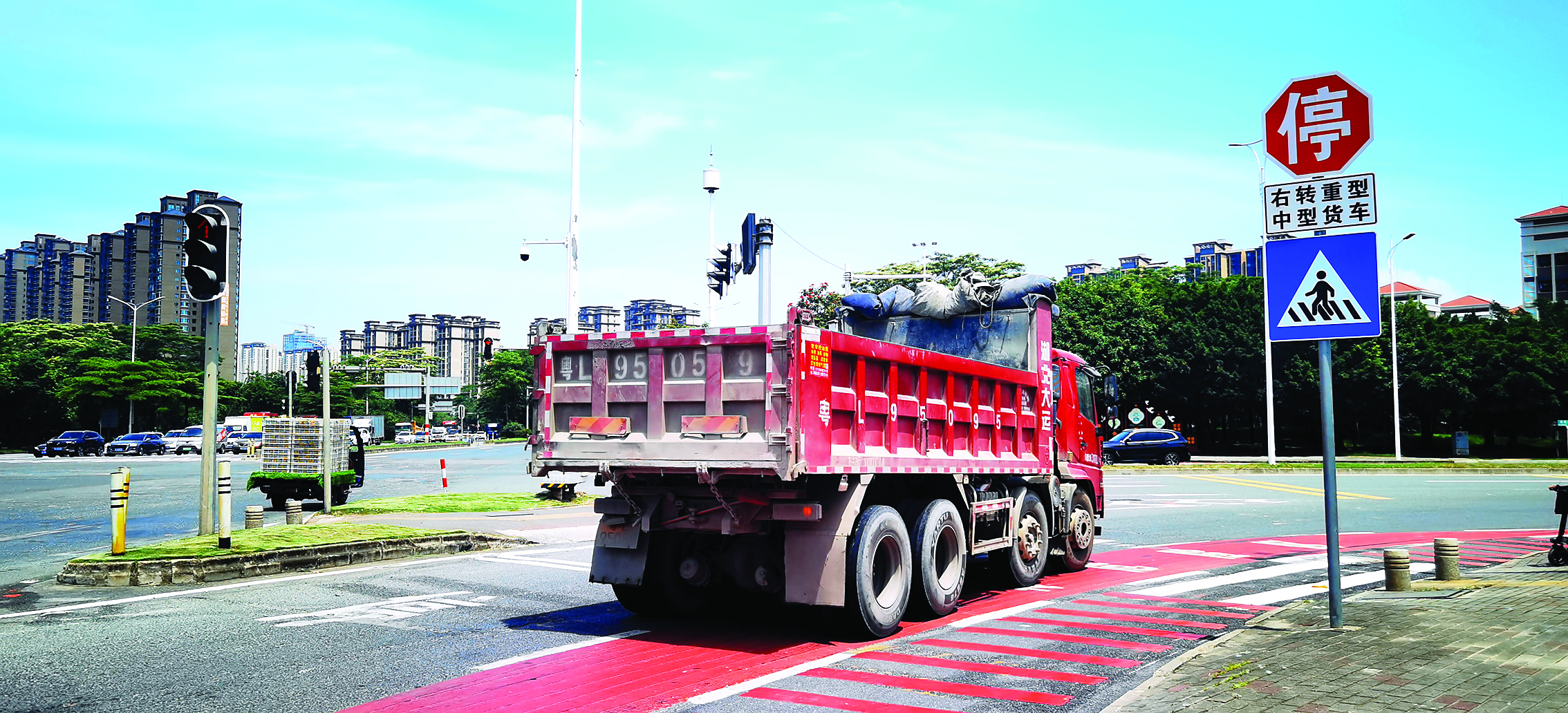 5月15日上午,記者在惠州市區(qū)三環(huán)北路與惠民大道交會(huì)路口看到,重型中型貨車(chē)“右轉(zhuǎn)必!苯煌ㄖ甘九埔寻惭b到位,路口右轉(zhuǎn)輔道交通標(biāo)線也已重新施劃,并用醒目紅色設(shè)置一塊狹長(zhǎng)的“右轉(zhuǎn)危險(xiǎn)區(qū)”,時(shí)刻警醒著過(guò)往的重型中型貨車(chē)和行人及非機(jī)動(dòng)車(chē)注意安全、有序通行。