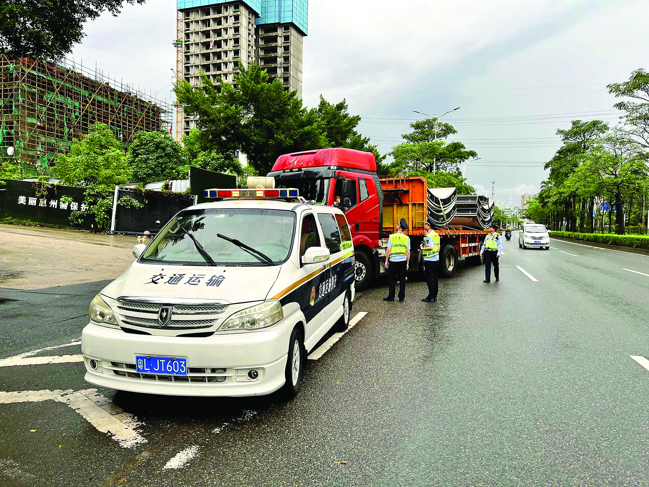 交通執(zhí)法人員檢查貨運(yùn)車輛;葜萑請(bào)記者戴建 通訊員鐘慧綺 攝