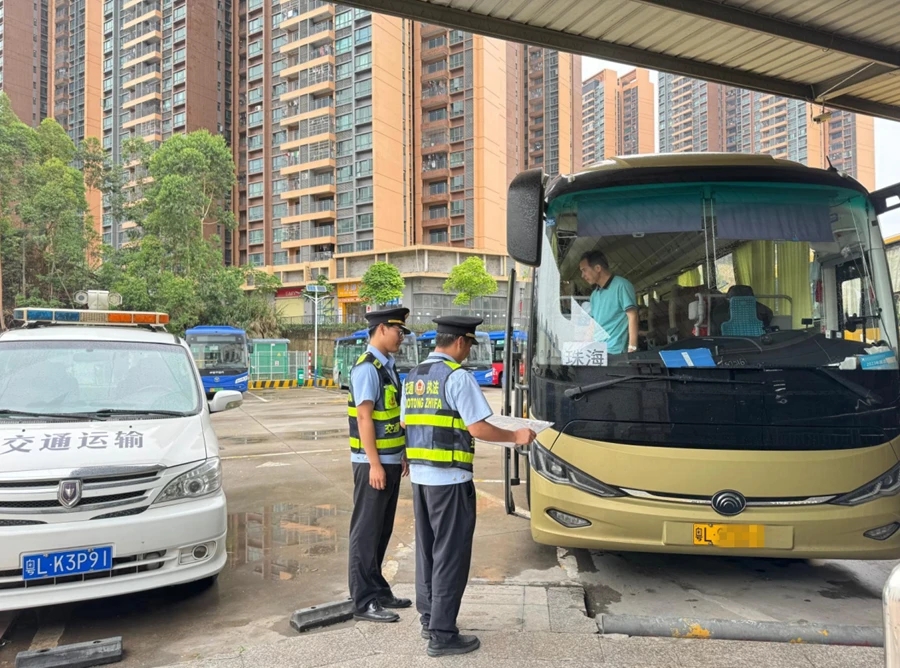 交通執(zhí)法人員檢查客運(yùn)車輛。