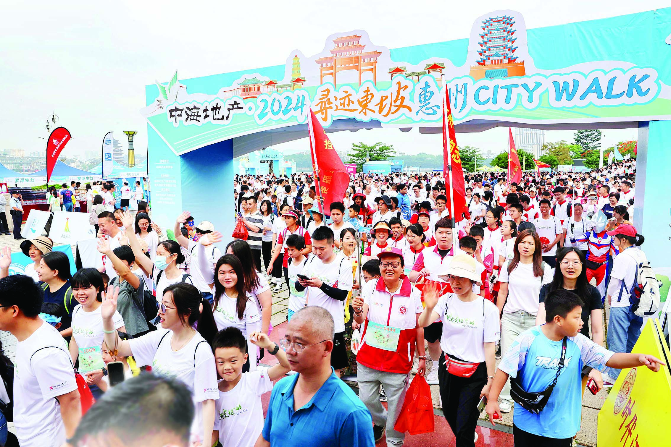 追尋東坡步伐,發(fā)現(xiàn)惠州的城市之美,2024“尋跡東坡”——惠州City walk活動當天上午7點半在東江公園啟動,來自大灣區(qū)各地3000名徒步愛好者,身著統(tǒng)一的T恤,用健康運動的方式感受惠州城市美景。他們順著風光秀麗的東江美景一路向前,經(jīng)過惠州西湖東坡園、蘇堤等多處東坡寓惠點,最終抵達東坡祠,全程約11公里。美景如同畫卷般漸次鋪展,領略東坡人文地標的風情。