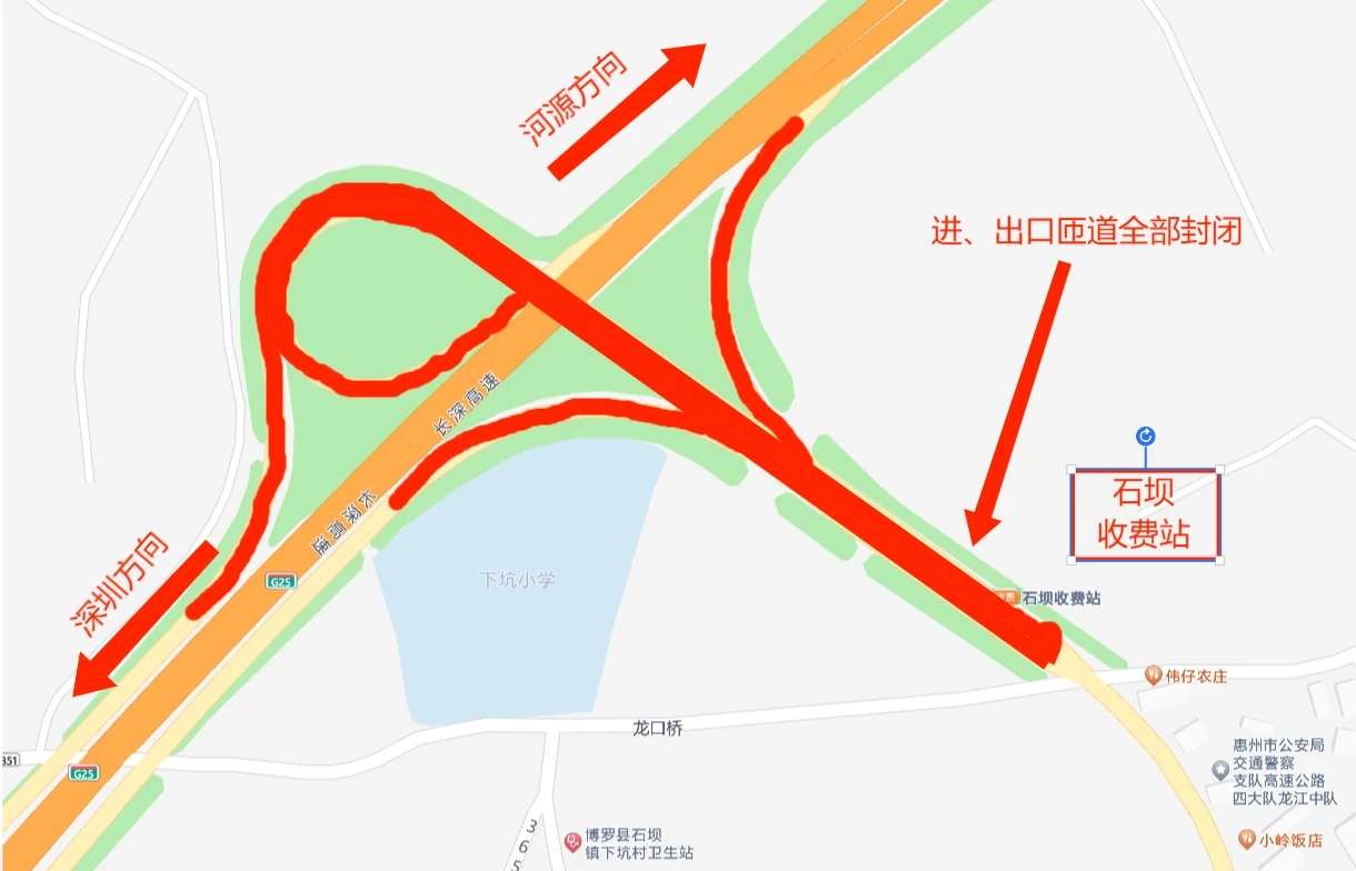 6月1日12:00至12月31日12:00,長深高速惠州段(惠河高速公路)石壩收費站進、出口匝道全部封閉,禁止車輛通行。