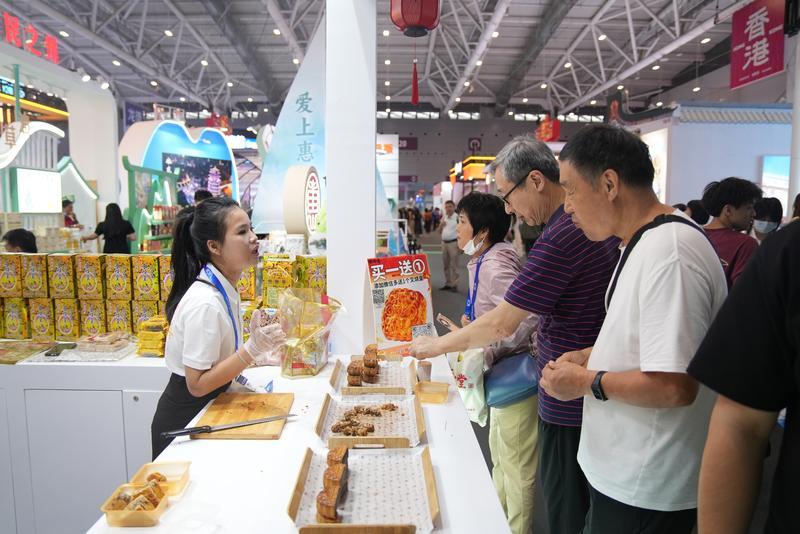 惠州館內(nèi),游客在郭師傅月餅展位前駐足品嘗。惠州日?qǐng)?bào)記者羅劍業(yè) 攝