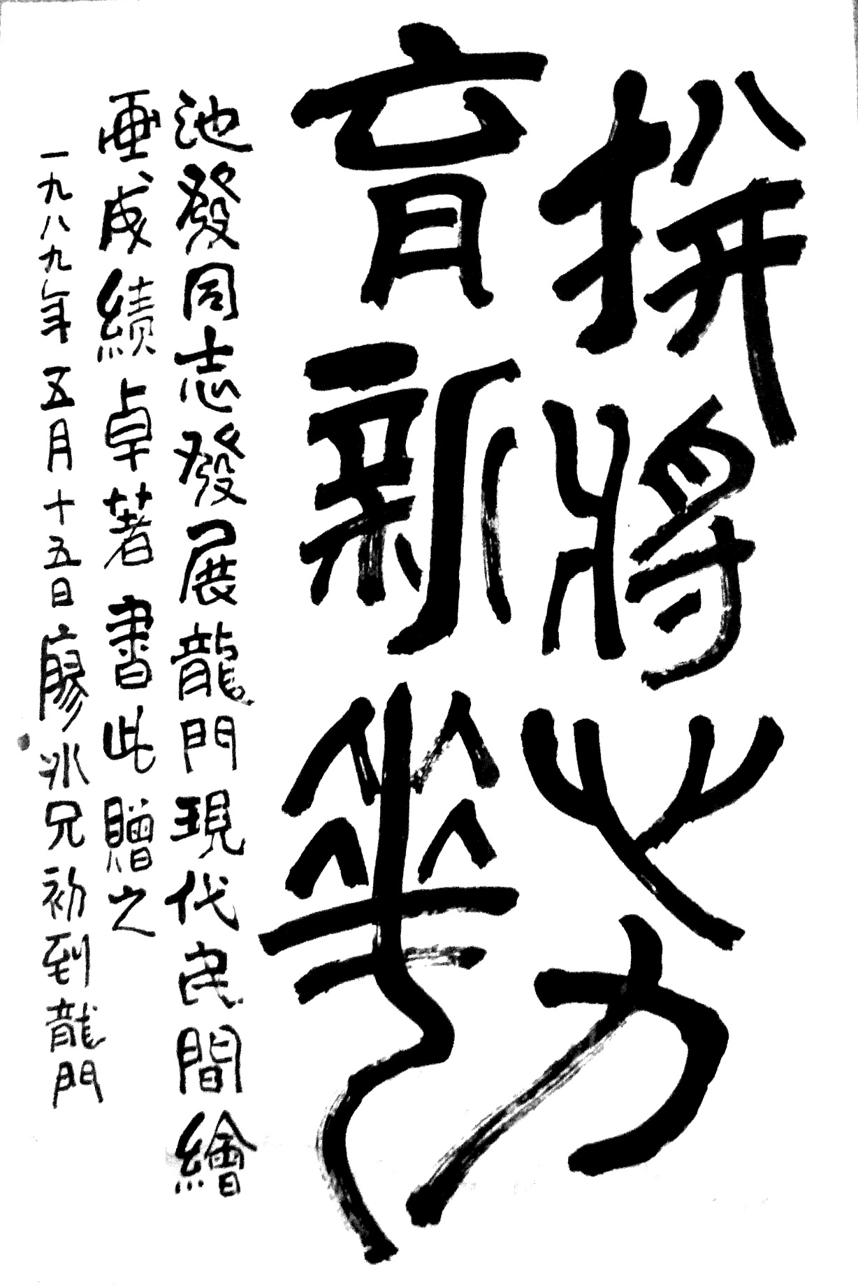 1989年初夏,著名漫畫家廖冰兄第一次到龍門,看見風(fēng)格獨(dú)特的龍門農(nóng)民畫,心生歡喜,欽佩譚池發(fā)“發(fā)展現(xiàn)代民間繪畫成績(jī)卓著”,題字“拼將心力育新花”贈(zèng)之,既是對(duì)譚池發(fā)培養(yǎng)繪畫人才的贊譽(yù),也是對(duì)龍門農(nóng)民畫后續(xù)發(fā)展的期望。