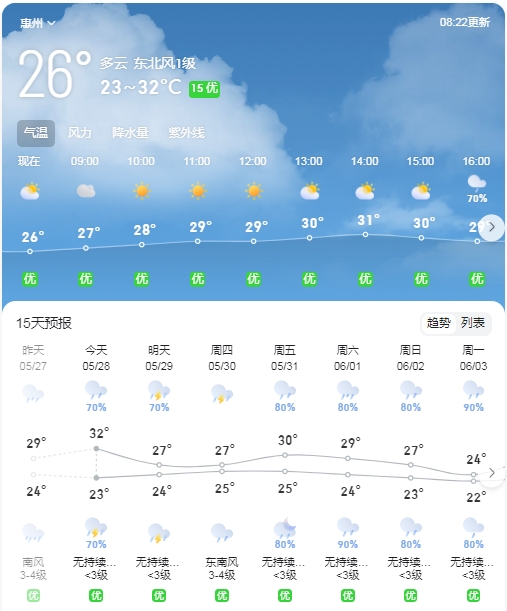 “未來(lái)一周我市降雨較頻繁,部分時(shí)段雨勢(shì)較大,并伴有短時(shí)強(qiáng)降水、雷雨大風(fēng)等強(qiáng)對(duì)流天氣!笔袣庀笈_(tái)預(yù)報(bào):周二白天至周三,陰天到多云有雷陣雨,氣溫22~30℃;周四,有雷陣雨局部大雨,氣溫23~27℃;周五,有中到大雨局部暴雨,氣溫24~28℃;周六至周日,有大雨到暴雨,氣溫25~28℃。