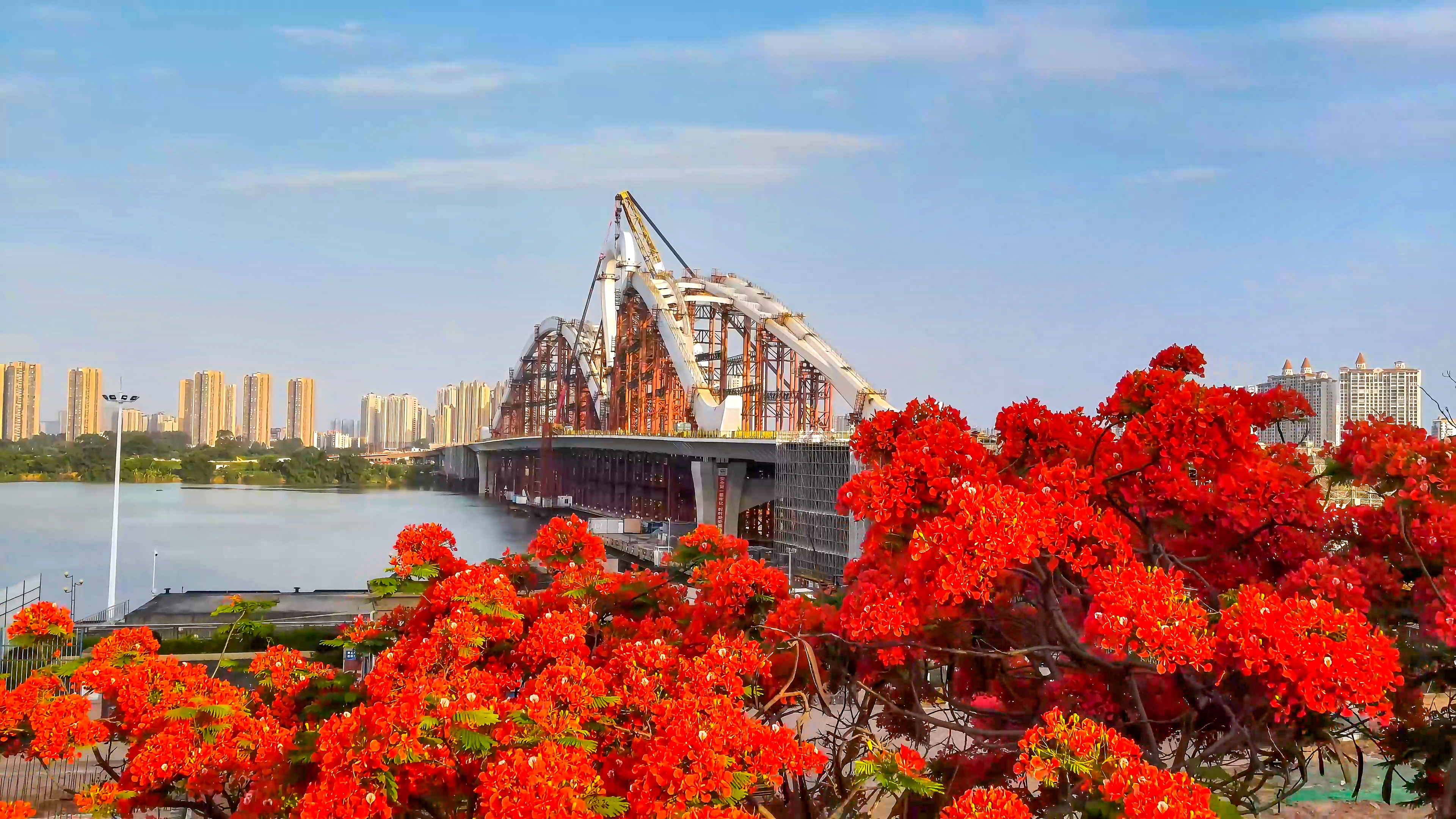 以寬闊的東江美景為底色,在建的惠州鵝城大橋潔白的“雙鵝”相依偎,優(yōu)美修長(zhǎng)的“鵝頸”拼成一個(gè)愛心形狀。鵝城大橋畔,鳳凰花熱烈盛開,如火焰般舞動(dòng)在天際,與“雙鵝”相呼應(yīng),繪出一幅美麗的畫卷。