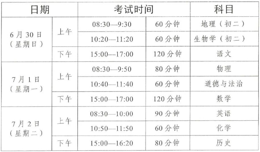 2024年省統(tǒng)一命題地市的初中學(xué)業(yè)水平語文、數(shù)學(xué)、英語、道德與法治、歷史、地理、物理、化學(xué)和生物學(xué)等科目考試時間安排如下: