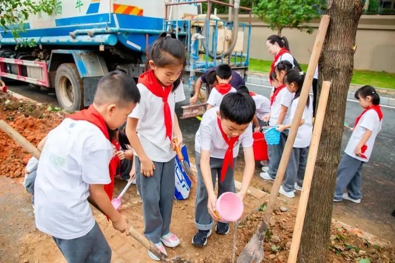 莊嚴(yán)的入隊(duì)儀式結(jié)束后,隊(duì)員們開(kāi)展“入隊(duì)種棵樹(shù)”活動(dòng)。在輔導(dǎo)員的帶領(lǐng)下,他們拿起鏟子、水桶,揮鍬填土、踩實(shí)松土、提桶澆水,相互合作,干得熱火朝天。一株新苗,一鍬厚土,一瓢清水,樹(shù)木植于土,把保護(hù)環(huán)境、熱愛(ài)自然的種子播撒到少先隊(duì)員心中。一(1)中隊(duì)的少先隊(duì)員彭紫嫣說(shuō):“今天,我和同學(xué)們一起入隊(duì)了,并且種下一棵小樹(shù),就像老師和爸爸媽媽們呵護(hù)我們成長(zhǎng)一樣,我小心翼翼為小樹(shù)澆水、填土。希望我能和這棵小樹(shù)一樣茁壯成長(zhǎng),成為優(yōu)秀的少先隊(duì)員,為其他同學(xué)樹(shù)立一個(gè)好的榜樣!”