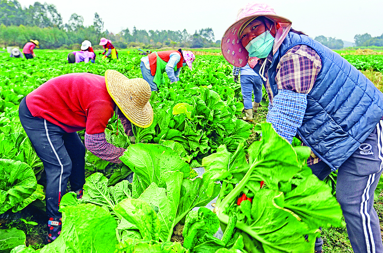 冬天,橫瀝鎮(zhèn)矮陂村村民在田里收割梅菜。