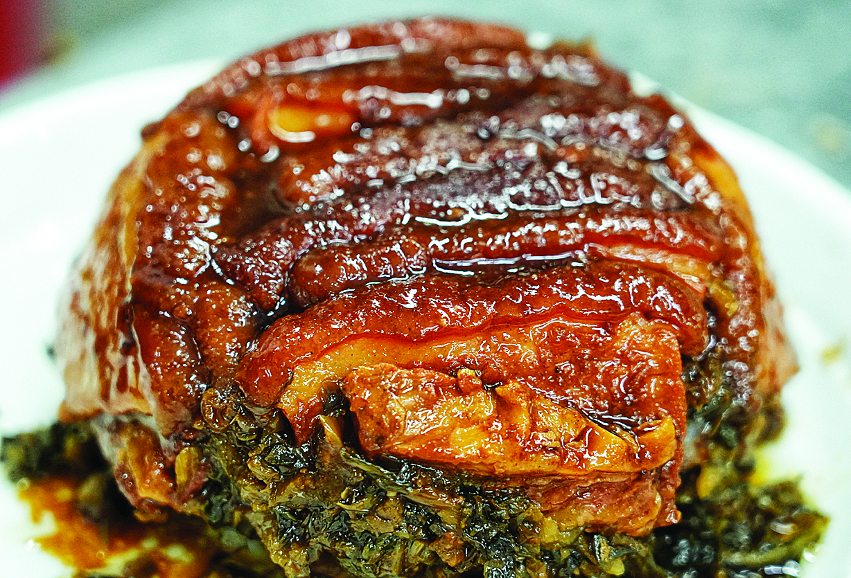 將五花肉煮透,加老抽炸上色,切成肉片盛入碗里,上鋪梅菜段,倒入原湯蒸透。半小時(shí)后,一道肉爛味香、咸中帶甜、肥而不膩的梅菜扣肉就可以上桌了。2011年,梅菜扣肉與東坡肉等四種客家菜式組合成的“東江客家菜制作技藝”,被列入惠州市級(jí)非物質(zhì)文化遺產(chǎn)名錄。