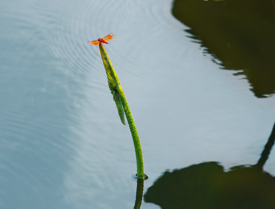 蜻蜓在荷葉上小憩。