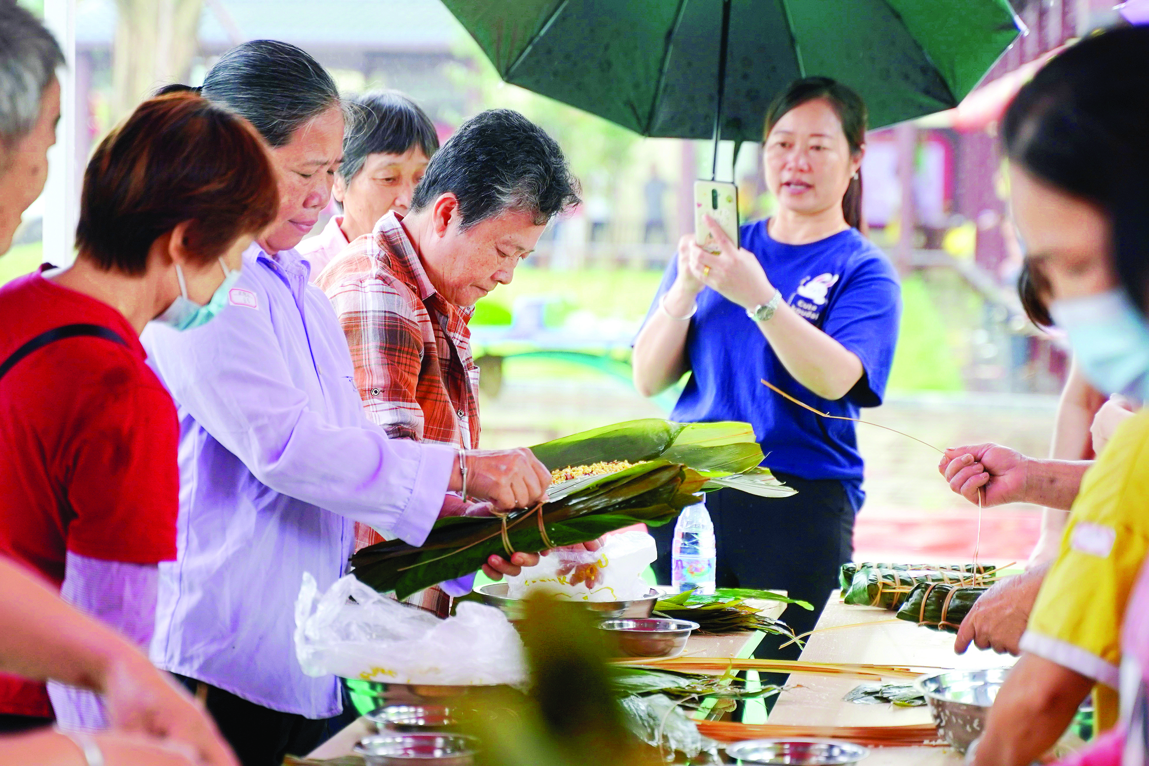 盡管天空下起了雨,但群眾的熱情一點(diǎn)不減。選手們早早來到現(xiàn)場準(zhǔn)備參賽事宜。在簡短的文藝表演后,裹粽子大賽正式拉開序幕。