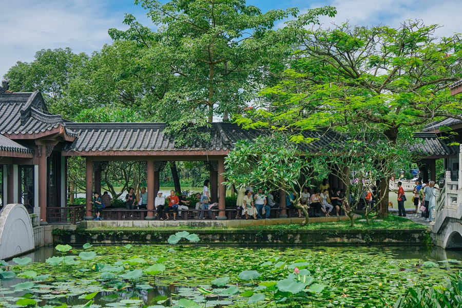 五、六月的惠州,雨水頻密?删驮诙宋缂压(jié)當(dāng)日,太陽又切換了回來。盡管還不是豐渚園荷塘里最絢爛的時景,卻也讓湖畔多了不少前來賞花打卡的游客。