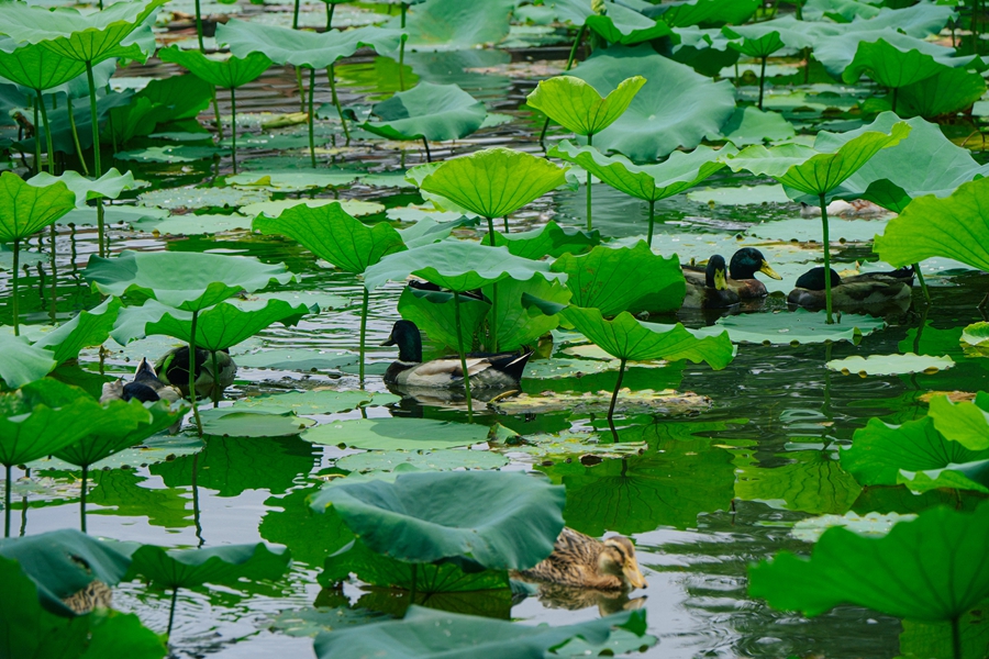 成隊的鴨子在蓮葉間嬉戲。