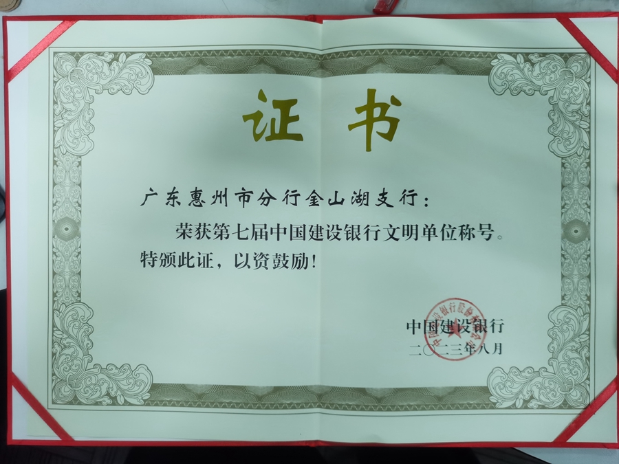 金山湖支行榮獲“第七屆中國建設(shè)銀行文明單位”稱號。