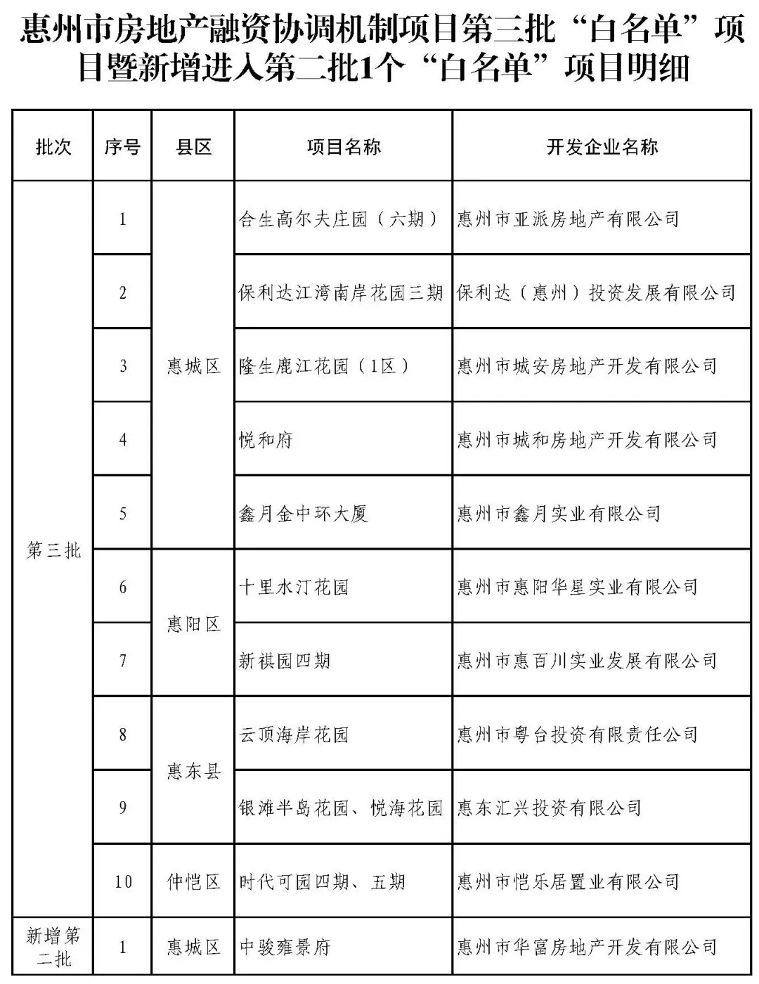 市住建局相關負責人介紹,目前,納入惠州市協(xié)調機制的“白名單”項目,金融機構與項目公司加速磋商銜接,加快推動項目落地見成效,前兩批次列入“白名單”的項目獲得的銀行授信融資金額超過了110億元,進一步滿足我市房地產項目融資需求。
