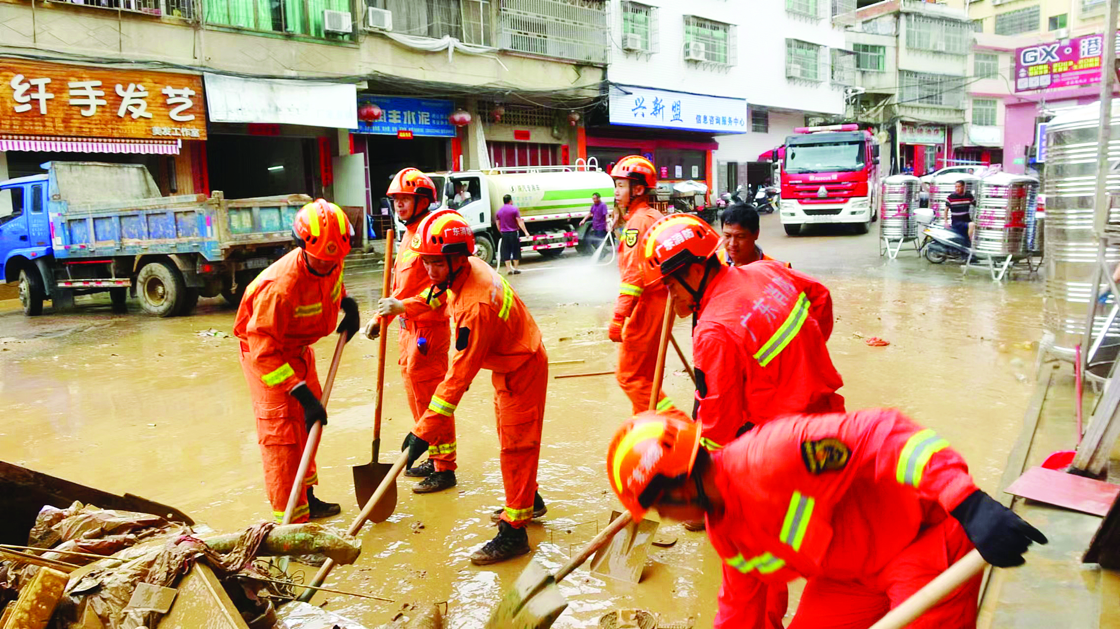 惠州消防隊員在清理街道上的淤泥雜物。惠州日報記者譚琳 通訊員惠消宣 攝