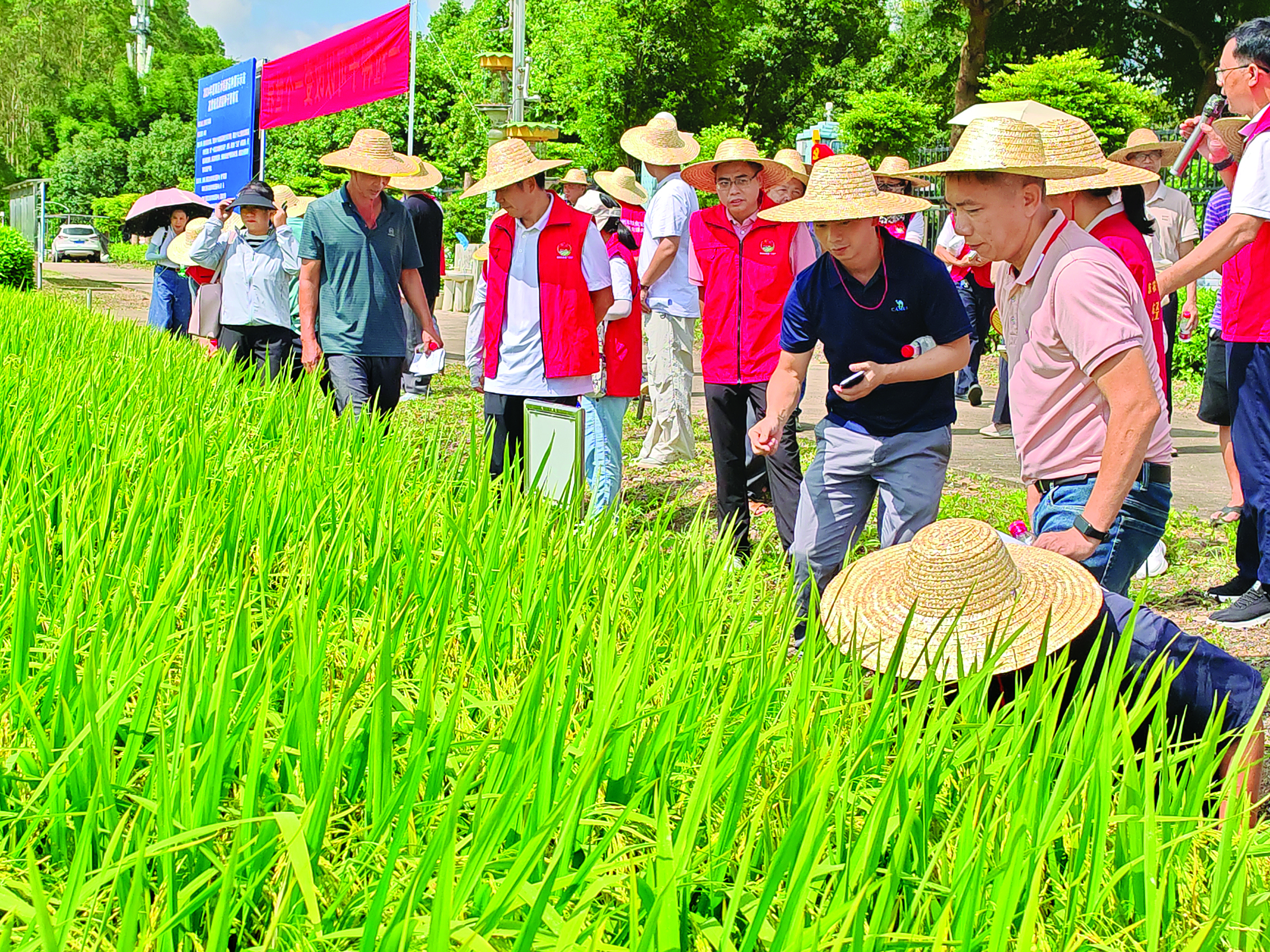 參加觀摩會的人員在田間地頭考察早造水稻優(yōu)新品種。惠州日報記者陳春惠 攝