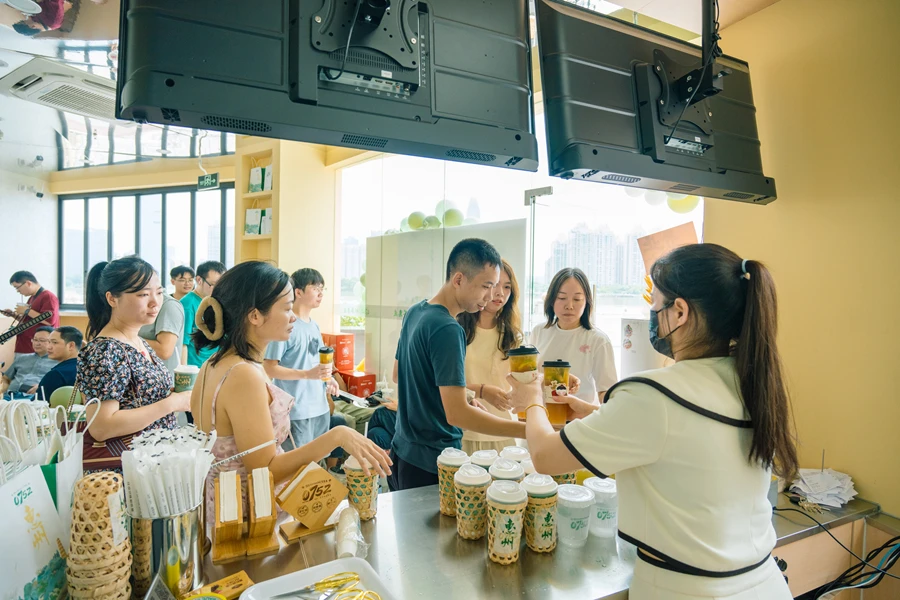 開業(yè)當天,市民瀲滟和顏顏也碰巧在水東街逛街,看到0752有新店開業(yè),就聞聲走了進來。瀲滟說,之前已多次喝過0752的茶,味道很合自己口味,而且這個品牌融合了惠州的區(qū)號,創(chuàng)意十足,龍門竹海、巖韻檸檬茶等飲品也很有惠州本地文化氣息。