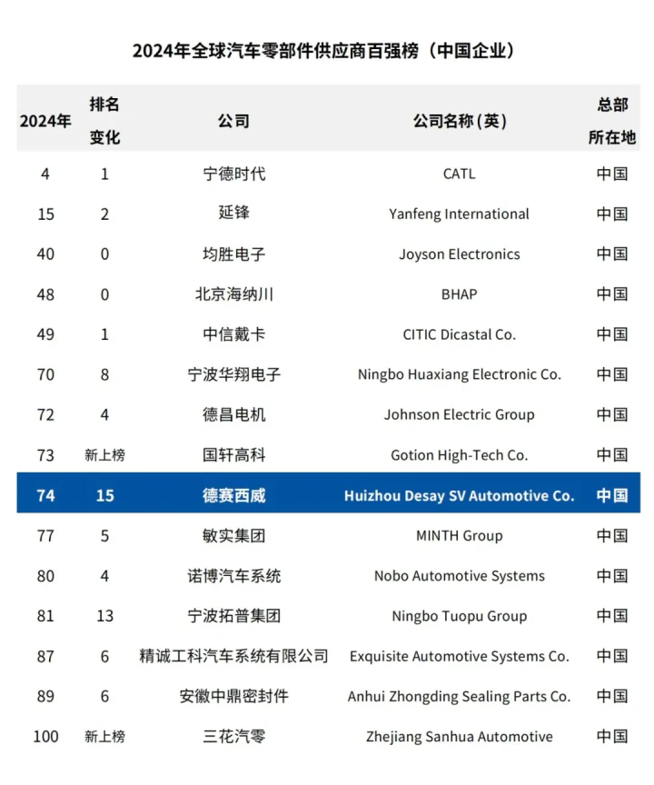 6月23日,《美國汽車新聞》(Automotive News)發(fā)布2024年全球汽車零部件供應(yīng)商百強(qiáng)榜;葜菔械沦愇魍囯娮庸煞萦邢薰具B續(xù)四年登榜,今年位列榜單第74位,較去年排名大幅上升15位,是本年度排名上升幅度最大的企業(yè)。