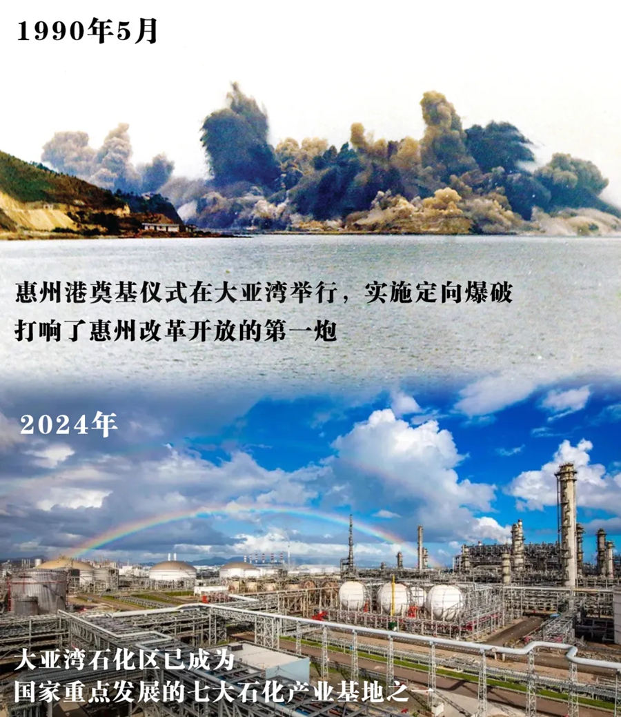 上圖:1990年5月,惠州港實施了建港大爆破,原先矗立在大亞灣海邊的石坳島被削平,一塊巨大的新陸地取代了原先長500米、寬400多米的海峽。它打響了石化城建設的第一炮,也打響了惠州改革開放的第一聲“春雷”。
