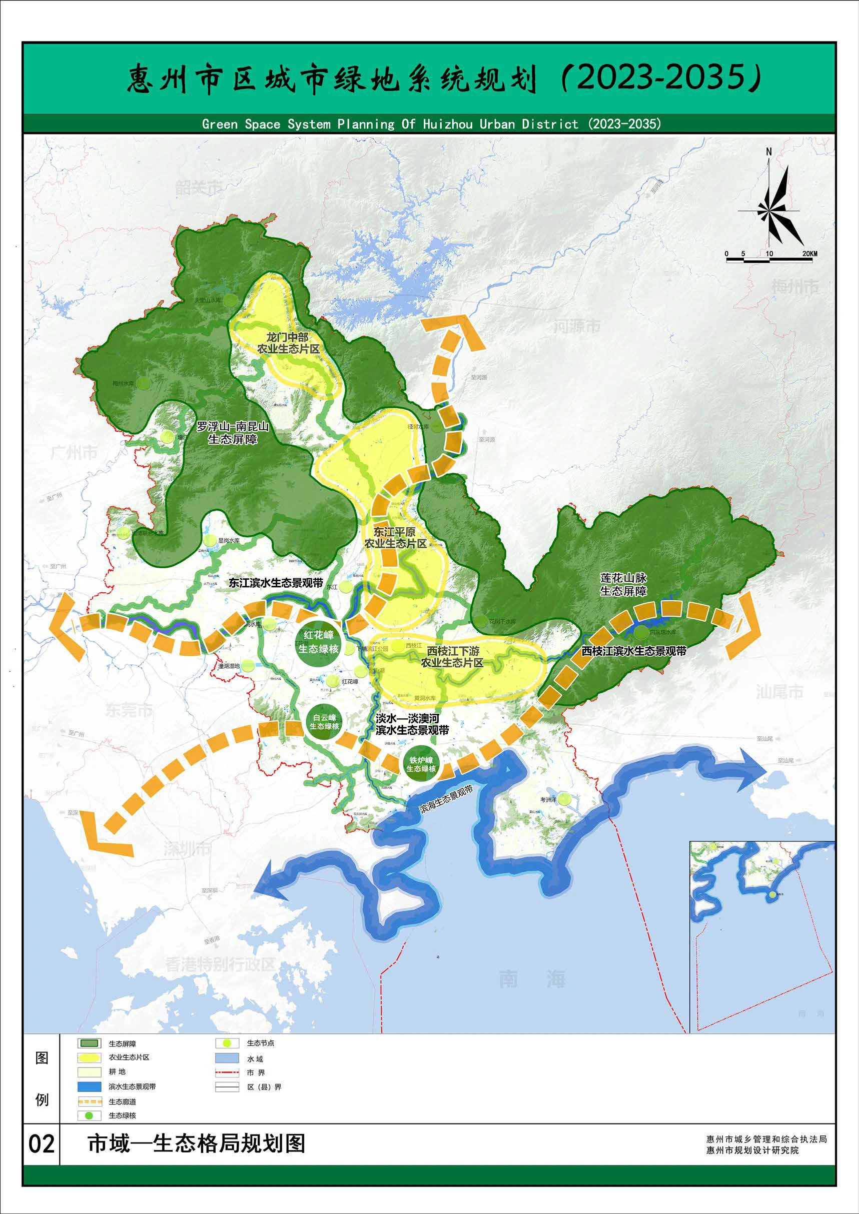 惠州市域綠色生態(tài)空間格局根據(jù)惠州市北部擁山、南部襟海的市域山水形態(tài)特性,構(gòu)建“一屏、二廊、三核、三片、四帶”的山水結(jié)構(gòu)!耙黄痢保罕辈可搅稚鷳B(tài)景觀屏障!岸取保喊自漆帧F爐嶂—蓮花山、象頭山—紅花嶂—白云嶂二條生態(tài)景觀廊道!叭恕保杭t花嶂生態(tài)綠核、白云嶂生態(tài)綠核及鐵爐嶂生態(tài)綠核三個生態(tài)綠核。“三片”:龍門中部、東江平原、西枝江下游三大農(nóng)業(yè)生態(tài)片區(qū)!八膸А保貉貣|江、西枝江、淡水—淡澳河、濱海四條濱水生態(tài)景觀帶。